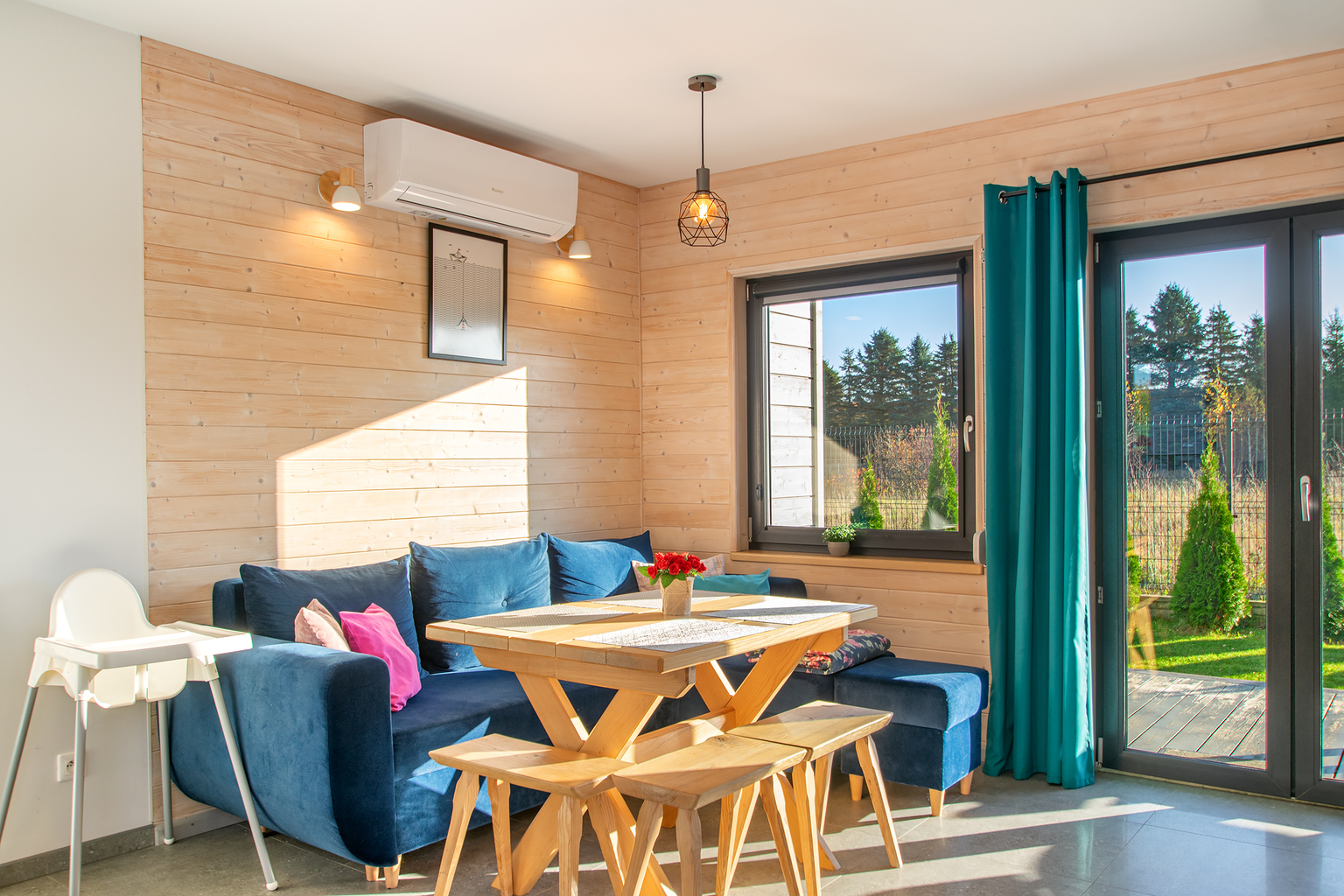 Domek ma dwie sypialnie: jedną z dużym łóżkiem podwójnym i łóżkiem pojedynczym oraz drugą z dwoma łóżkami pojedynczymi, co daje wygodę dla rodzin i grup. Dodatkowo w salonie znajduje się rozkładana sofa, która zapewnia miejsce do wspólnego odpoczynku i noclegu.